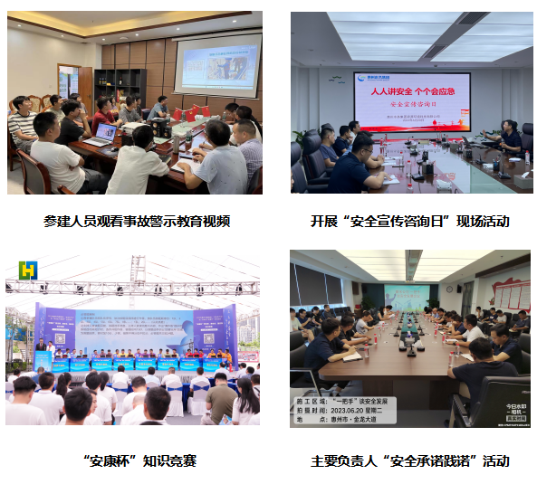 集團(tuán)積極參與安全生產(chǎn)網(wǎng)絡(luò)知識(shí)競(jìng)賽,組織參與人數(shù)173人,答題446次,發(fā)布視頻3個(gè)。參與拍攝制作科普宣傳片《惠州市工程建設(shè)領(lǐng)域有限空間作業(yè)及應(yīng)急演練示范視頻》,積極普及安全生產(chǎn)常識(shí)。承辦惠州市建筑施工“安康杯”知識(shí)競(jìng)賽,吸引23萬(wàn)余人觀看,集團(tuán)所屬市水電建筑公司榮獲本次“安康杯”知識(shí)競(jìng)賽最佳組織獎(jiǎng)。開(kāi)展企業(yè)主要負(fù)責(zé)人“安全承諾踐諾”活動(dòng)10場(chǎng),參與171人次,推動(dòng)企業(yè)主要負(fù)責(zé)人嚴(yán)格履行安全生產(chǎn)職責(zé),帶頭尊法、學(xué)法、守法。