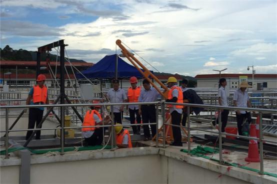 “深洞”中實(shí)施維修。經(jīng)過長(zhǎng)達(dá)近8個(gè)小時(shí)堅(jiān)持不懈的帶水搶修作業(yè),維修人員終于在池底找到另一半斷裂的葉輪,并成功將攪拌機(jī)葉輪拆卸下來(lái)。剩下的工作,則更需要潼湖水廠和衷共濟(jì)、攻堅(jiān)克難,把斷裂的攪拌機(jī)葉輪焊接回原處。在高溫炙烤的悶熱天氣下,維修人員不負(fù)眾望、排除萬(wàn)難,順利完成維修任務(wù),2組高效反應(yīng)池得以及時(shí)恢復(fù)正常使用。