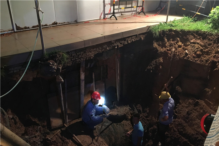 7月13日,該工程正式動(dòng)工。8月14日凌晨1:00,施工人員開始對(duì)江北水廠外的DN1600管道接駁處和該廠內(nèi)的堵板焊接處進(jìn)行雙向同時(shí)施工。在確保安全文明施工的前提下,經(jīng)過(guò)21個(gè)小時(shí)的緊張施工,于8月15日下午4:00終于成功完成該段DN1600上水管遷改接駁通水工作,江北水廠恢復(fù)正常供水。