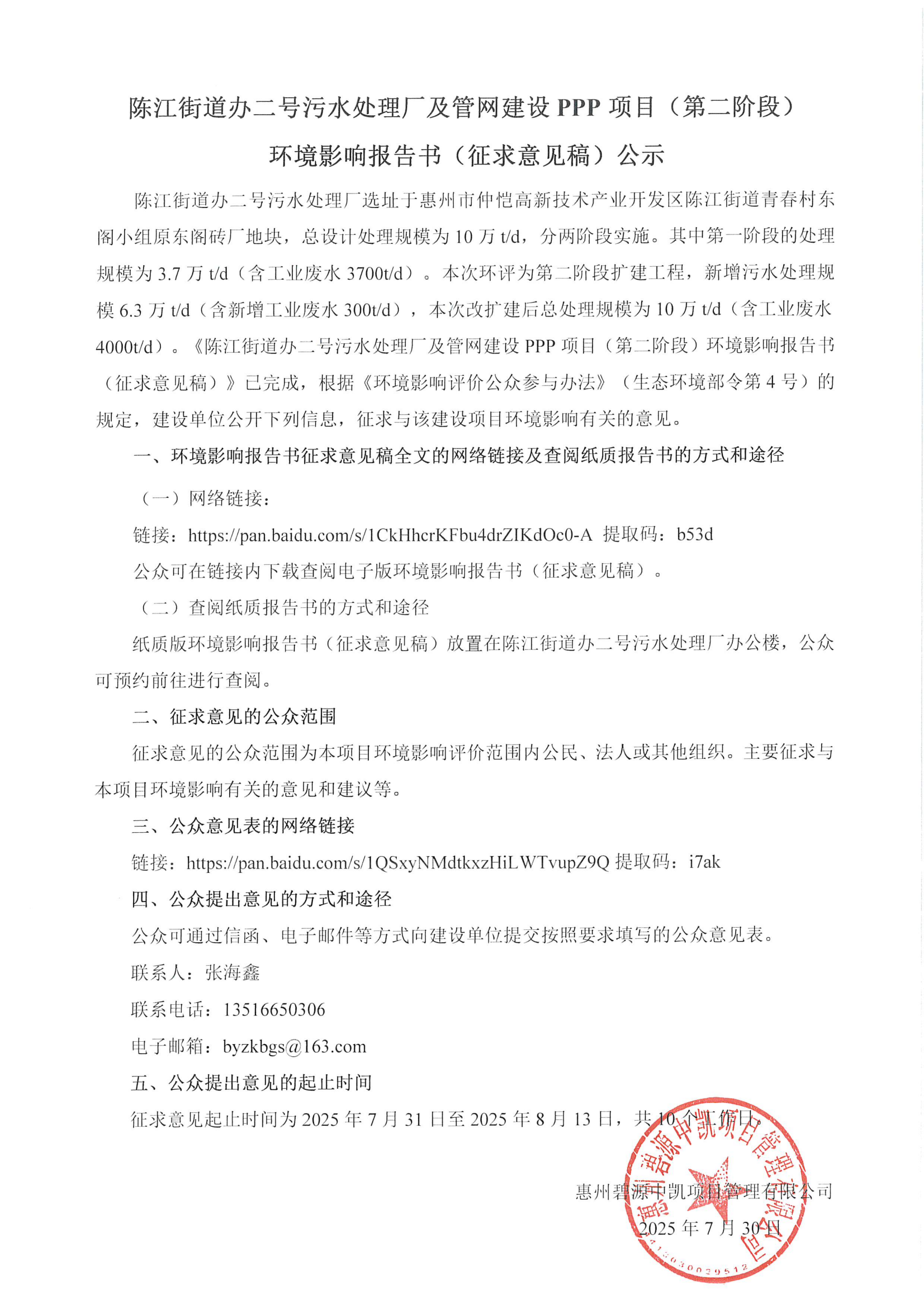 陳江街道辦二號(hào)污水處理廠及管網(wǎng)建設(shè)PPP項(xiàng)目(第二階段) 環(huán)境影響報(bào)告書(shū)(征求意見(jiàn)稿)公示