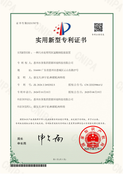 繼連續(xù)斬獲四項(xiàng)污水、污泥處理相關(guān)技術(shù)專利后,惠州水務(wù)集團(tuán)碧源公司在水務(wù)環(huán)保技術(shù)創(chuàng)新領(lǐng)域再傳捷報(bào)。8月19日,由碧源公司自主研發(fā)的“一種污水處理用次氯酸鈉投放裝置”榮獲國(guó)家知識(shí)產(chǎn)權(quán)局授予專利權(quán)并頒發(fā)實(shí)用新型專利證書。至此,公司已在水務(wù)環(huán)保領(lǐng)域累計(jì)斬獲五項(xiàng)國(guó)家授權(quán)專利,涵蓋污水、污泥處理等多個(gè)關(guān)鍵技術(shù)環(huán)節(jié)。