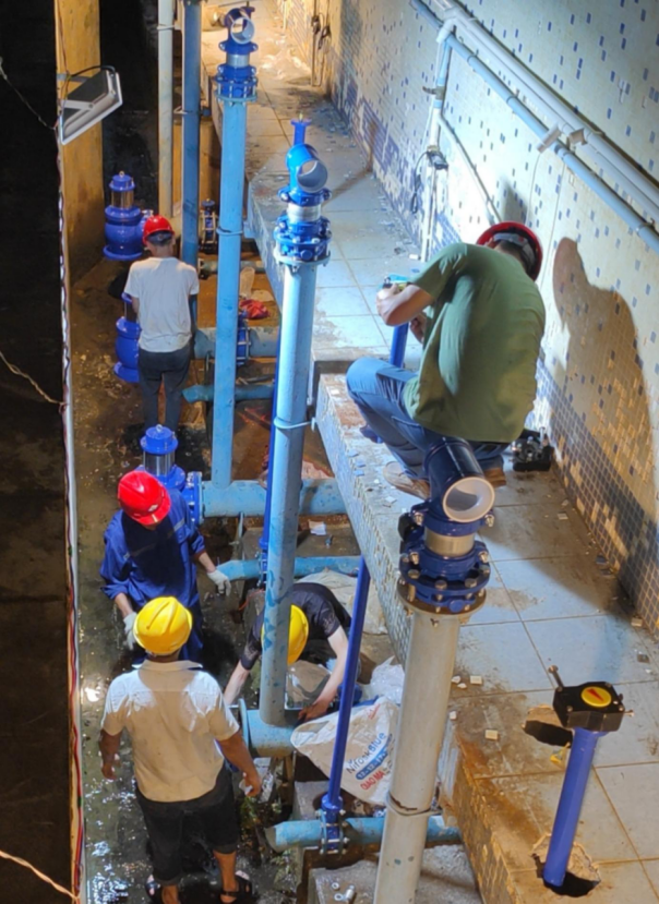 至凌晨3點(diǎn),所有需更換的設(shè)備全部安裝完畢,經(jīng)過細(xì)致地調(diào)試與檢查,完全符合技術(shù)要求!現(xiàn)場頓時爆發(fā)出興奮的輕呼——平流池可以通水,恢復(fù)制水了!此時,城市仍在沉睡,燈火逐漸稀疏。